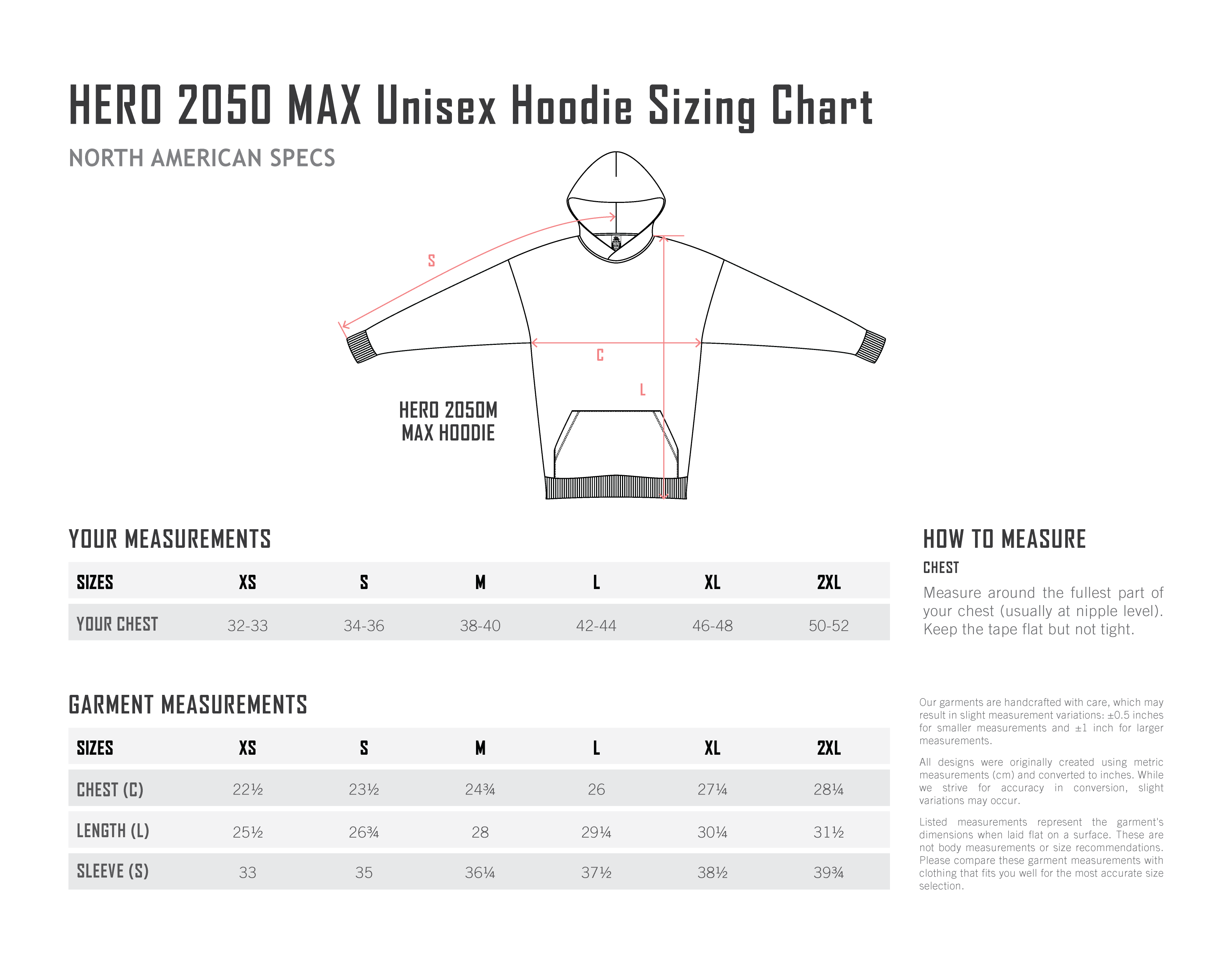 | Chest (C) | 22.5 in | 23.5 in | 24.75 in | 26 in | 27.25 in | 28.25 in |